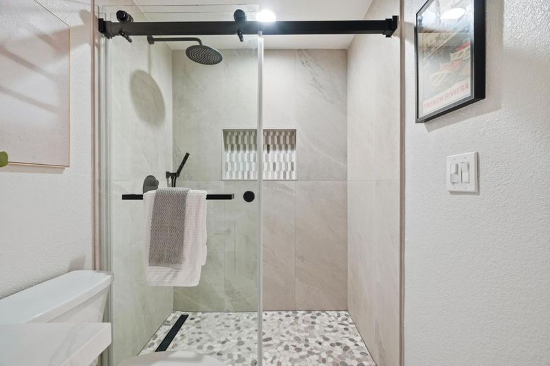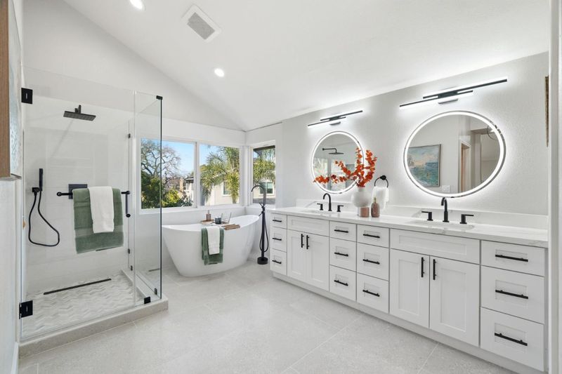 - Double Sinks, Full on Ground Floor, Primary - Stall Shower(s), Shower over Tub - 1, Stall Shower, Tile, Tub in Primary Bedroom, Updated Bath