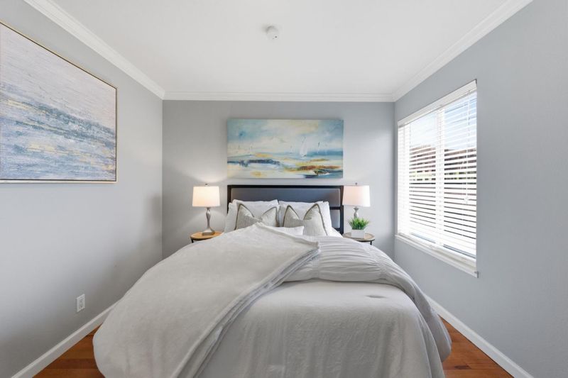 A top-floor end unit condo offering bright interiors, thoughtful updates, and an unbeatable Millbrae location. An entry alcove creates a welcoming sense of arrival while warm wood flooring & crown molding provide a cohesive, refreshed feel throughout. The living room is open and airy with a mono-pitched ceiling & clerestory windows drawing in abundant light. Sliding doors open to a covered balcony extending your living space. The adjacent updated kitchen has ample countertop and storage space with granite countertops and tall cabinetry, while the connected breakfast nook is a cozy gathering space defined by a glass bowl pendant light. 2 bedrooms are separated by a hallway for privacy. The primary suite features an updated ensuite with a bamboo vanity with Carrara Gio slab countertop, Hansgrohe fixtures, and a glass-enclosed shower with Daltile Sapphire tile. The second bedroom is served by a full hallway bath. Located in the Mills High School District, this home sits close to Millbraes Broadway corridor, with Trader Joes, Safeway, local restaurants, and everyday amenities just minutes away. Less than a mile from the Millbrae Transit Center with BART/Caltrain and easy access to US-101, I-280, & SFO, this location supports an active daily lifestyle and effortless connectivity.